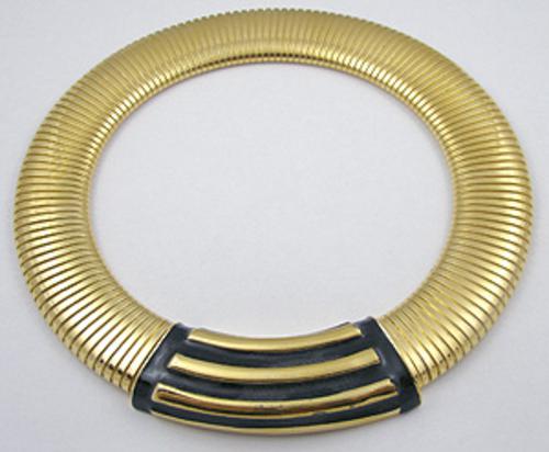 Description: Vintage Monet wide, dramatic gold plated stretchy and flexible gas pipe necklace with a large black enameled front centerpiece hiding the clasp, which follows the curve of the necklace and has four curved gold plated bars against the contrast of the black enameling. Signed 'Monet©' on the back of the centerpiece.