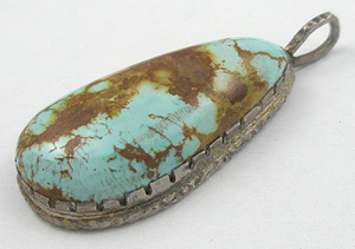 Description: Vintage old pawn Native American pendant, a large turquoise teardrop stone bezel set into an etched silver frame. The turquoise is pale with rust colored matrix.