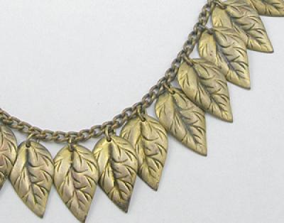 Description: Vintage brass leaves necklace; a total of 34 embossed brass leaves dangling from the brass chain. Stunning!