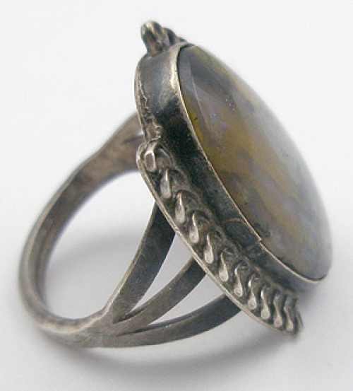 Description: Native American sterling ring with a large oval gray and tan petrified wood or scenic agate stone in a simple bezel setting framed by a looping wire design on either side.
