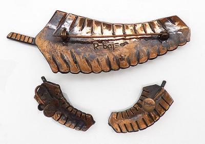 Description: Vintage Rebajes banana leaf brooch and matching screw back earrings; a deep burnished copper with thickly etched details. Shown on page 19 of "Copper Art Jewelry" by Matthew Burkholz. Signed 'Rebajes' on all pieces.