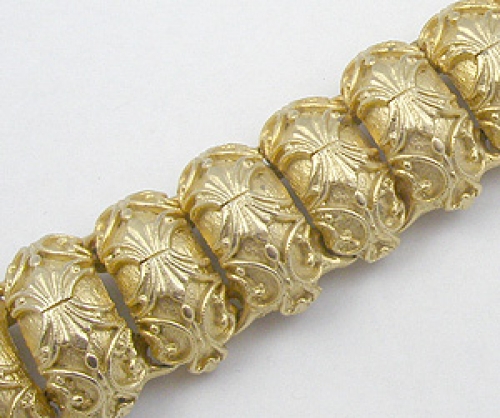 Description: Tortolani chunky, heavily decorated gold plated link bracelet, each of the thirteen curved links stamped with an intricate 3-dimensional design. Signed '©Tortolani' on the back.