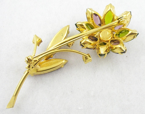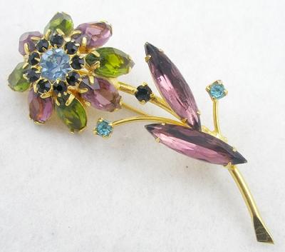 Description: Vintage highly domed flower pin a long gold tone stem. The petals are alternating amethyst and peridot green rhinestone navettes around a light blue round rhinestone center surrounded by small opaque black rhinestones. Two very large amethyst rhinestone navettes serve as leaves with two aqua and one black rhinestone on wires as buds.