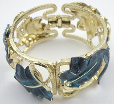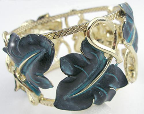 Description: Wide vintage gold plated hinged clamper bracelet decorated with a vine of black enameled leaves with painted turquoise veins and detailing.Hinged on the bottom, top closure.