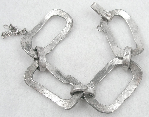 Description: 1970's A.D. Design Denmark modernist silver plated chunky link bracelet. A.D. Design is listed as the mark for J. Andersen and Erik Dennung in Copenhagen, 1971-1979. The bracelet is four heavy hammered silver links with thick connectors and a narrow silver safety chain. Signed 'A.D. Design Made in Denmark' on the simple hook clasp.