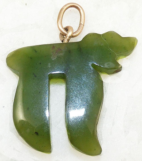 Description: Vintage carved jade Chai pendant; beautiful translucent green nephrite jade. Chai is the Hebrew word for 'life', symbolic in Judaism. Gold tone bail and jump ring for a chain.