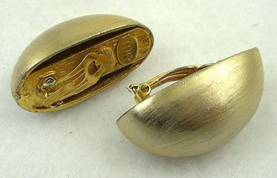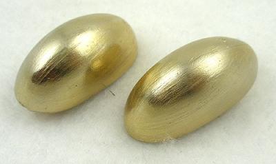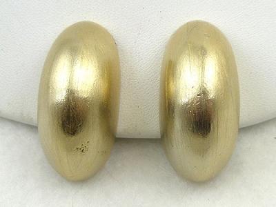 Description: Vintage Mary Ellen Stewart thick and chunky oval gold tone clip earrings. Highly domed large ovals done in a lightly textured matte gold finish. Signed 'm.e.' on the backs.