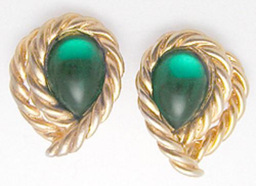 Description: Vintage P&M Paris clip earrings with large gold tone rope teardrop earrings set with a huge green glass teardrop stone.