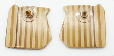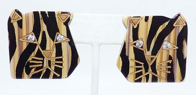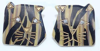 Description: Vintage laminated galalith tiger or big cat pierced post earrings; narrow cream and tan pin stripes with wider black stripes on the front. Carved whiskers, and nose eye and ear accented with gold enamel and clear rhinestone eyes.