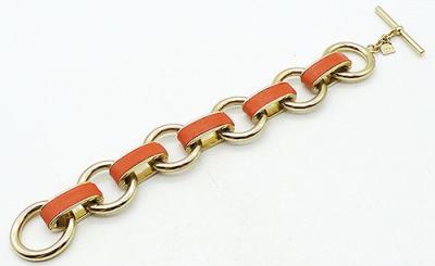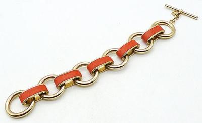Description: Banana Republic orange leather and gold tone link bracelet; the round links alternate with flat oval links wrapped in orange leather. Toggle clasp with a square hang tag marked with the Banana Republic back-to-back 'BR' logo.