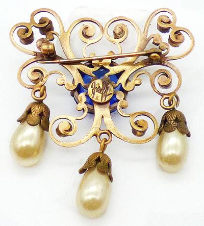 Description: Joseff of Hollywood vintage gold plated glass cabochon and pearl drops brooch; an elegant design with gold plated wire scrolls set wth small faux seed pearls and tiny clear rhinestones in the curls. A large sapphire blue glass cabochon is in the center and a trio of faux pearl drops hang from the bottom. Signed 'Joseff' on the back.