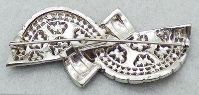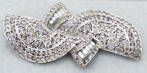 Description: Boucher vintage rhodium plated openwork flowers pavé set clear rhinestone brooch; opposing wide curved fan shaped ribbon or swag design, each with ends set with a row of clear rhinestone baguettes. Unsigned attributed to Boucher.