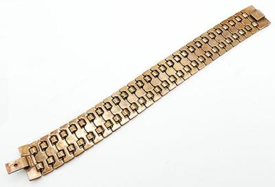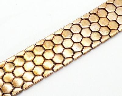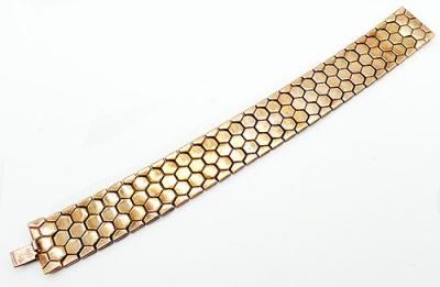 Description: Trifari vintage gold plated tessellated honeycomb link bracelet; the links have an interlocking 6-sided honeycomb design. Hidden push-in clasp. Patented by Alfred Phillipe in 1945, signed 'Trifari' on the back of the clasp. .