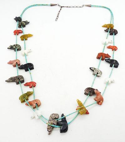Description: Zuni vintage genuine stone bear fetish double strand turquoise bead necklace; a variety of different colored carved bears, appear to be different types of agate, strung on two very narrow turquoise bead strands which are clasped into sterling silver bones with etched flower decoration. A total of 27 bear fetishes in a combination of gray, black, rust, green, tan, and white stones. Silver extender on both sides with hook clasp.