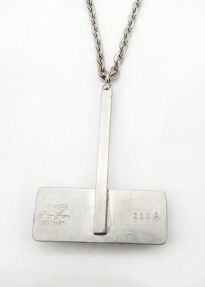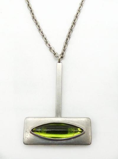 Description: Jorgen Jensen Denmark vintage pewter mid-century modernist necklace; a tee shaped pendant on its original chain. The pendant has a wide rectangular base set with a narrow lime green glass pointed oval stone, the base is bisected with a tee bar that attaches to the chain. Signed 'Jorgen Jensen' 'Pewter' 'Denmark' and style number '230A' on the back. -