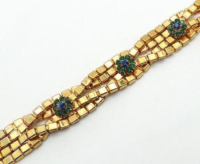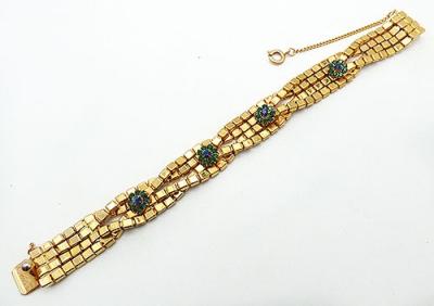 Description: Hobé vintage gold tone braided square chain bracelet, the four lengths of linked squares chain are braided and woven together. Four emerald green rhinestone florets with capri blue rhinestone centers are spaced along the band where the chains intersect. The lengths are joined at the push-in clasp which is signed 'Hobé' on the back.
