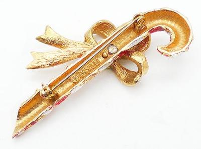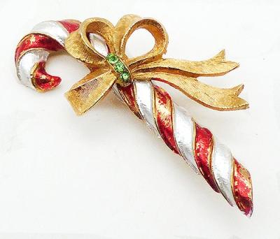 Description: Mylu gold plated enameled candy cane brooch; the stripes are alternating silver and red enamel tied with a gold tone bow with a row green rhinestones in the knot. Signed '©Mylu' on the back.