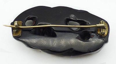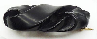 Description: Victorian Whitby jet hand carved and pierced lover's knot brooch; a gorgeous example symbolizing eternal love. The brooch is an oval with twisted and wide overlapping bands carved from a single piece of jet.