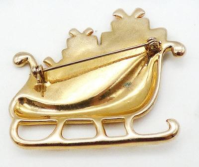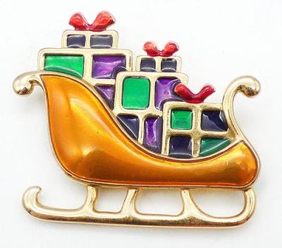 Description: Gold plated Christmas sleigh brooch; enameled in gold and piled with brightly enameled gifts. The gift squares are enamel in purple, green and dark navy with red enameled bows on top.