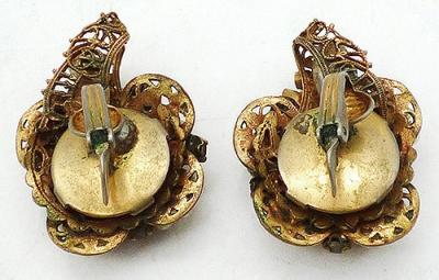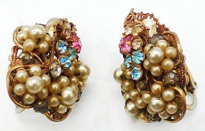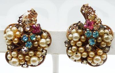 Description: Robert unsigned faux pearl and rhinestone flower clip earrings; the gold tone filigree flower has petals covered with small faux pearl florets. A filigree curl spills over the top down to the center with a pink rhinestone, aqua rhinestone and clear rose monteés. A larger faux pearl is tucked in behind the curl. Attributed to Robert based on design and type of signed clip backs, as seen on item #222067 in our archives.