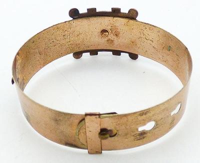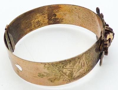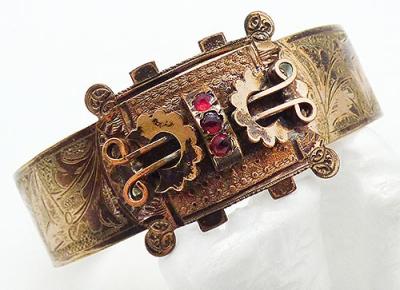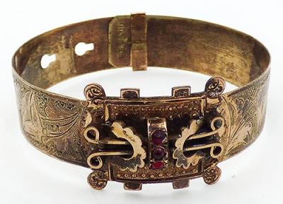 Description: Victorian era 10K rolled gold garter style bracelet made by the W.E. White company somewhere between 1876 and 1892. The thin band is beautifully etched with flowers on the top half with a central rectangular element designed in a buckle motif with three rose cut red stones across the middle. The bottom has a knob and hook closured with a slide the holds the band in place. Signed 'W.E. W & Co on the end of the inside of the band, mark for W.E. White & Company.