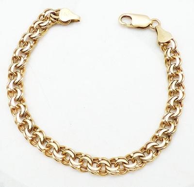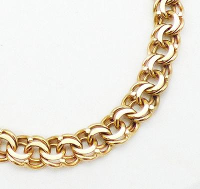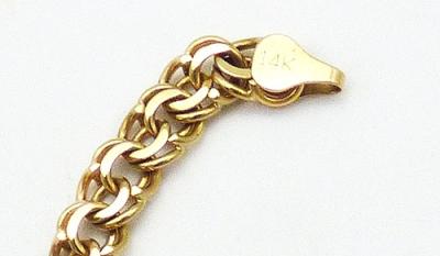 Description: Fine 14K yellow gold double curb chain bracelet, hallmarked and tested. Interlocking double curb chain links with lobster clasp. Signed with maker's mark 'FCL' and '14K' on both ends.