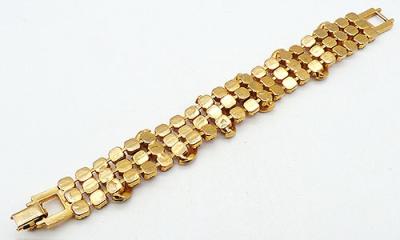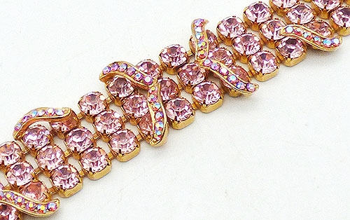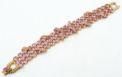 Description: Vintage gold tone pink rhinestone bracelet; the four rows of large pink prong set rhinestones are overlapped with short curls set with small pink aurora borealis rhinestones. The curls start at the side edges and curve towards the middle and are spaced evenly along the bracelet. Gold tone quilted pattern ends with a fold over clasp set with a pair of pink rhinestones.