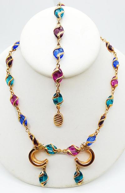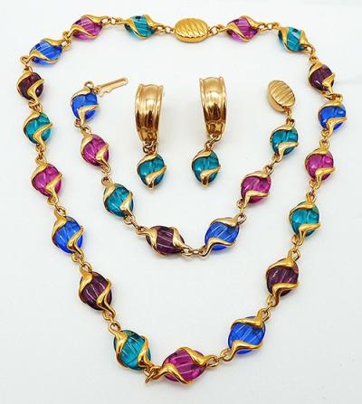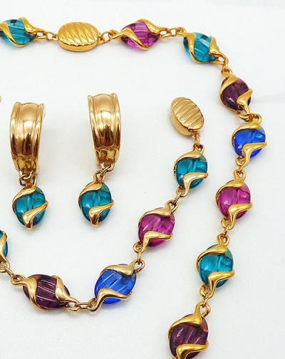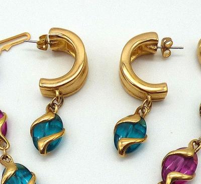 Description: Swarovski vintage multi-colored crystal bead gold tone link necklace, bracelet and semi-hoop drop earrings parure; the necklace and bracelet consist of jewel tone oval crystal beads; blue, pink, aqua and amethyst, each wrapped into a gold plated link with diagonal bands holding the beads. Eighteen links in the necklace and 8 links in the bracelet attach to a gold plated oval push-in clasp. The matching pierced post earrings are a gold plated semi-hoops wth a single aqua crystal bead dangle. Signed with a Swan mark on the necklace and bracelet clasp and inside the hoops, mark for Swarovski post 1986.