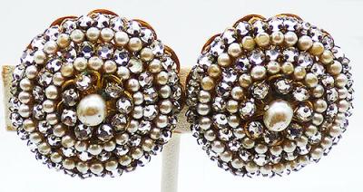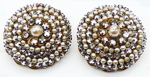 Description: Jonne by Schrager vintage crystal rose montee and faux pearl clip earrings; concentric alternating rows of faux pearls and clear rose montees surround the larger faux pearl in the center. /All are wired onto a gold plated filigree double backing. Signed 'Jonné' on the clips.