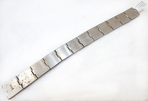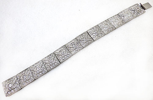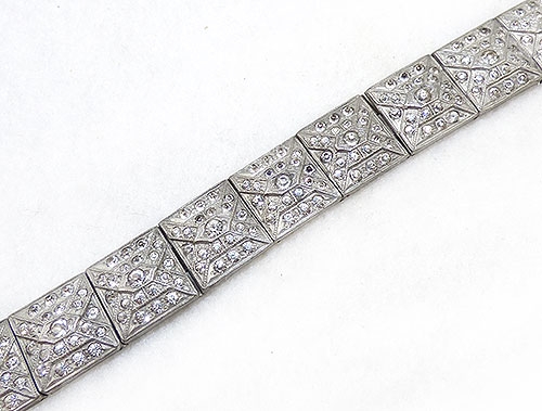 Description: Nov-E-Line period Art Deco flat hinged panel bracelet, each of the dozen nearly 1" silver metal square panels has a geometric design set with clear rhinestones. Signed 'Nov-E-Line' on the back of last lin which hides a push-in clasp.