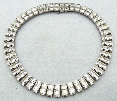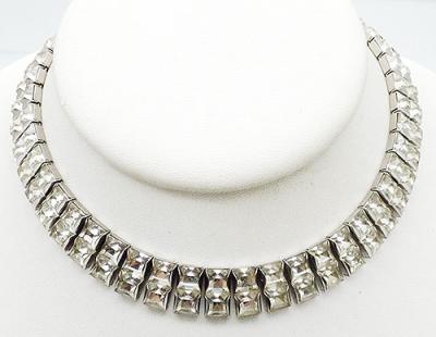 Description: Art Deco period silver tone clear rhinestone double link choker necklace; two rows of channel set square clear rhinestones set as pairs into rectangular links. Hidden push-in Art Deco period clasp. Note the smaller size, choker length, best worn high on the neck.