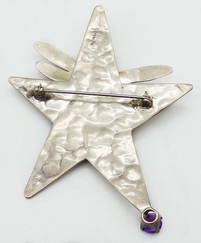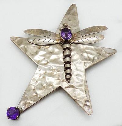 Description: Sterling silver dragonfly sitting on an oversized hammered sterling star brooch. A genuine oval amethyst is bezel set as the dragonfly’s head above the spiral flat wire body, a round amethyst is prong set at the tip of the bottom point of the star. Hallmarked ‘sterling’ on the back.