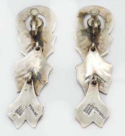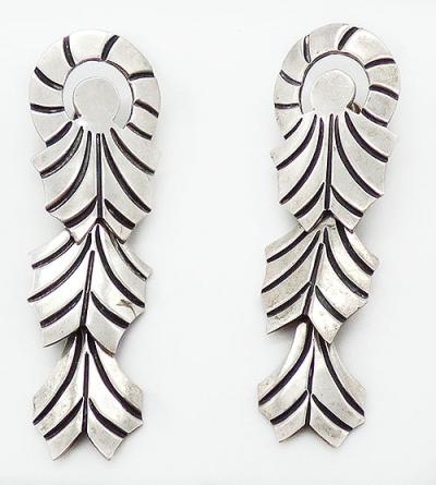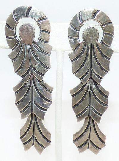 Description: Mexican sterling silver long dangling vintage screw post earrings; a deeply etched linked feather motif design with three sections. A circular feather design at the top with two tapered feather links dangling below. Signed 'HechoE 925VG Mexico' and 'Sterling' on the back of the last link.