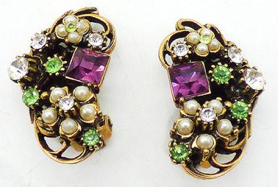 Description: Vintage gold plated filigree curled leaf clip earrings decorated with large and smaller faux pearl florets with clear rhinestone centers, a large square amethyst rhinestone and light green and clear rhinestone accents.