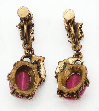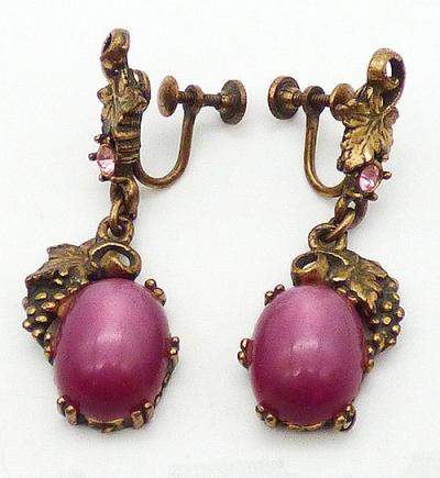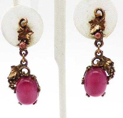 Description: Vintage gold tone grapes motif screw post earrings; a large magenta pink moonglow lucite oval cabochon with gold tone bunch of grapes along one side dangles from a large grape leaf at the top. Pink rhinestone accent.