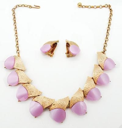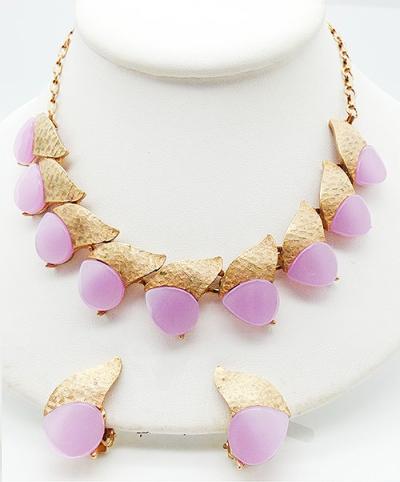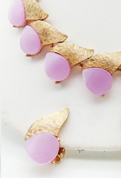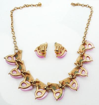 Description: Vintage gold plated leaves and light pink thermoset plastic petals necklace and clip earrings set. The nine necklace links are a textured gold tone leaf with a pink petal and they are attached to gold tone chain, hook clasp on one side. The earrings match a single link.