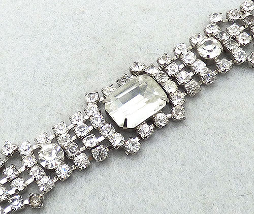 Description: Vintage 1950's silver tone clear rhinestone bracelet; a larger clear cushion cut rhinestone is in the center of four rows of clear rhinestone chains A curved row of rhinestone flank the center on either side and larger round rhinestones are on either side. Fold-over clasp.