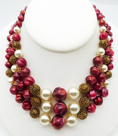 Description: Vintage burgundy plastic bead and faux pearl triple strand necklace; the three strands have graduated size beads that are largest in the middle and get smaller at the clasp. Most of the beads are marblized swirled burgundy plastic twist beads and are spaced with off-white plastic faux pearls and gold tone fiigree beads. Three strands attach to gold tone conectors with extender bead chain on one side and hook clasp on the other,