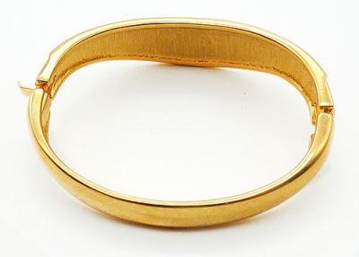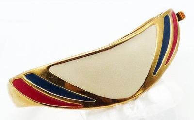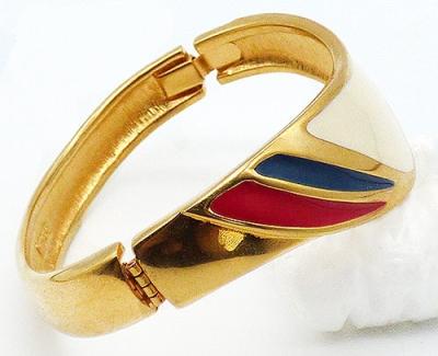 Description: Monet vintage gold pated hinged bangle bracelet with a tapered top that widens into a curve on one side. The curve is enameled in off-white with patriotic red and blue enameled stripes bordering the sides. It's hinged on one side with a push-in clasp on the other side. Signed '©Monet' on the inside.