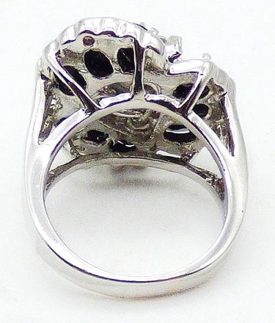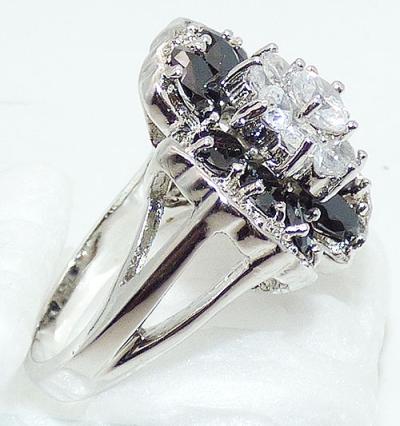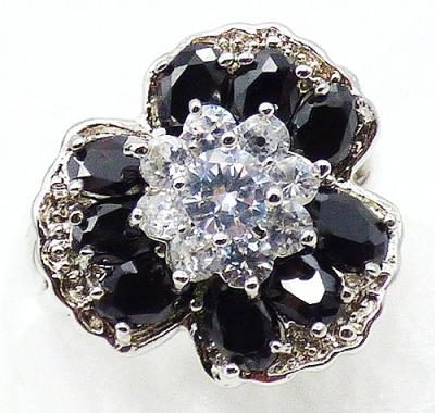 Description: Rhodium plated sterling silver black and clear cubic zirconia fashion ring; the center floret is set with princess cut clear cz's and wired onto the base of three petals, each set with a trio of marquis cut black cz's and edged with small clear cz's. Hallmarked '925' on the inside of the split band.