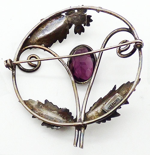 Description: Vintage sterling silver mid-century floral brooch; an oval amethyst glass flower with curling sterling wire stems and a pair of large leaves are inside a round sterling wire frame. An additional sterling leaf and small flower decorate the top of the frame. Hallmarked 'Sterling' on the back.