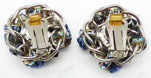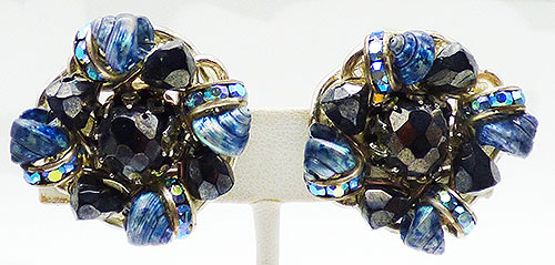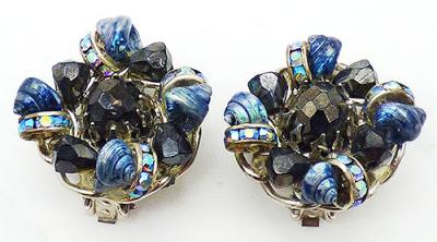 Description: Hobé vintage silver tone blue shell, black glass bead and rondelle clip earrings; iridescent dark blue mini shells next to Bermuda blue aurora rhinestone rondelles alternate with black faceted glass conical beads around a large round black glass bead in the center. The beads and shells are affixed to a silver tone backing with chain link border. Signed 'Hobé' on the back of the roller clips.