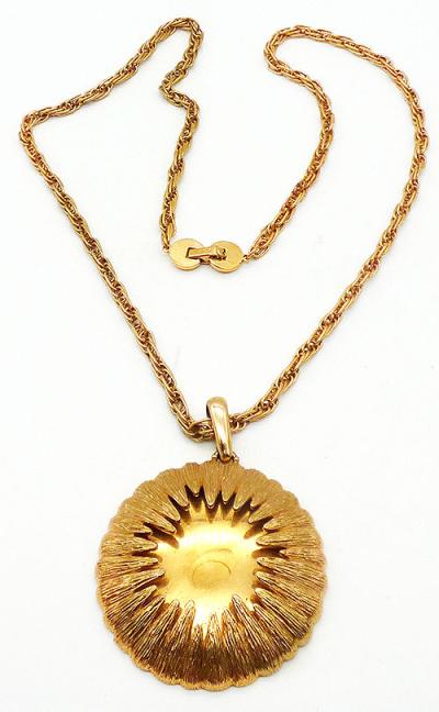 Description: Monet gold plated sunburst pendant necklace; a large round sunburst motif pendant with a textured gold tone explosion of jagged rays layered over a polished gold tone base showing through the center. The pendant is on a large bail hanging from a twisted gold plated chain with folder clasp. Signed 'Monet©' on the back of the pendant and clasp.