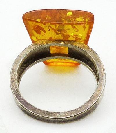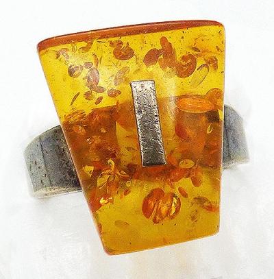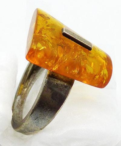 Description: Baltic amber sterling silver ring; a modernist design with an amber trapezoid mounted on a plain slightly tapered sterling silver band and held in place with a narrow sterling bar trough the center of the amber. Hallmarked '925' on the inside of the band.