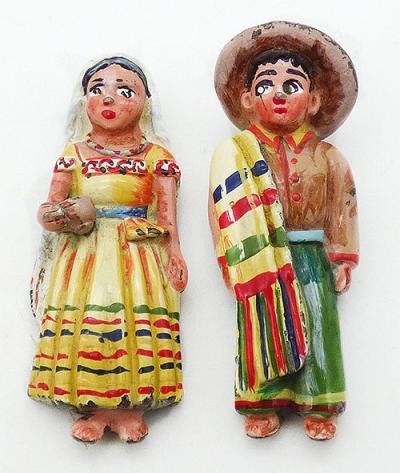 Description: Coro vintage pot metal enameled Mexican couple fur clips pair; the couple together is extremely rare; the woman is almost never seen. The woman is wearing a traditional Mexican dress, yellow enamel with green, black and red stripes, a white enamel mantilla and is holding a bowl. The man is wearing green pants, a tan shit and has a yellow serape with red black and green stripes draped over one should. He has a tan sombrero. Facial detail is clear on both. Unsigned attributed Coro.