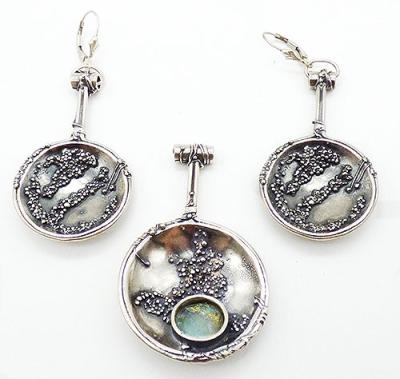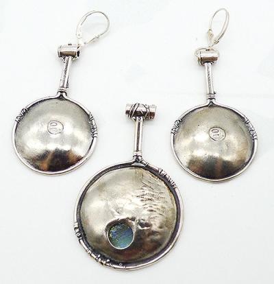 Description: Israeli sterling artisan pendulum pendant and matching earrings set; purchased directly from the artist in Jaffa, Israel in 2023. All three pieces are matching concave sterling silver pendulums with abstract granular decoration inside the bowls. The pendant is larger and has a round piece of sea glass offset inside the bowl. Signed '925' on the back with an illegible mark. Sterling ear wires on the earrings and a sterling chain can be provided for the pendant upon request.