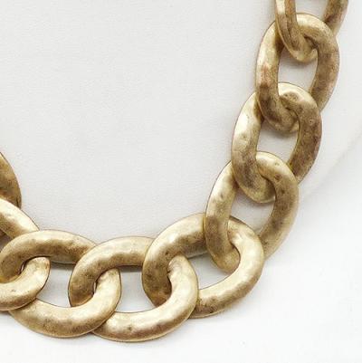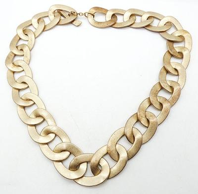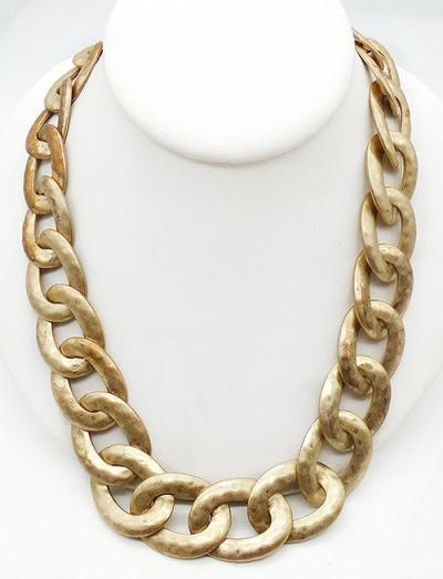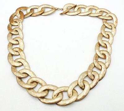 Description: Lauren Ralph Lauren chunky pale gold tone curb chain statement necklace; each of the large wide links have a lightly hammered satin finish on the front, flat finish on the back. Wide toggle clasp can be worn in front or at the back. Signed 'RLL" on the toggle. The Lauren label was launched in 1996.