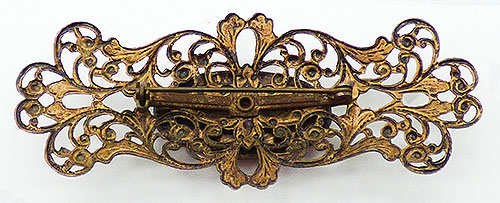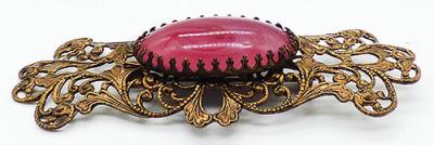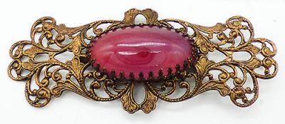 Description: Art Deco, possibly Czech, brass filigree and pink glass cabochon brooch, the large oval pink glass cabochon has subttle color variations and is set with fancy prongs in the center of the long filigree brooch.