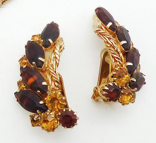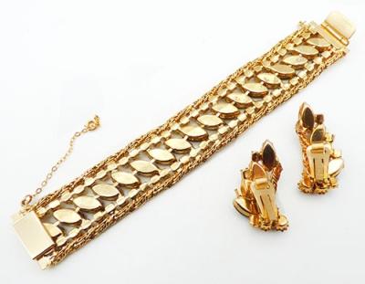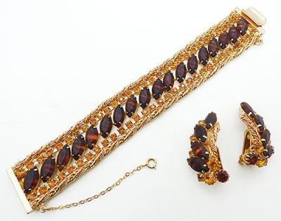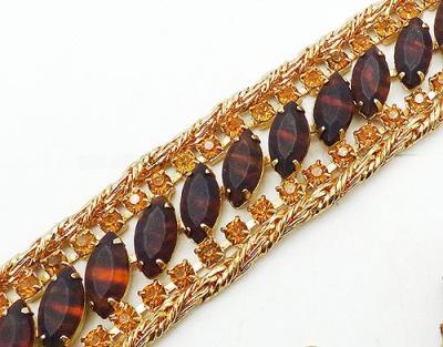 Description: Hobé brown striped art glass navette and golden topaz rhinestone vintage gold plated bracelet and clip earrings set; the bracelet has a row of the dark brown and amber striped navette stones set on the diagonal down the middle and flanked by a row of golden topaz round rhinestones on either side. The outside edges are bright gold tone braided twisted chain with a wide fold-over clasp and safety chain. The matching earrings are climber and have a sweep of the same navettes up to the top with golden and dark topaz rhinestone and the chain detail along the inside edge. Signed 'Hobé' on the back of the bracelet and on the earring roller clips.
