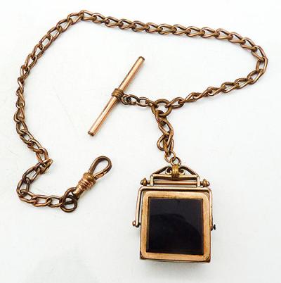 Description:  Victorian gold filled watch chain and reversible locket fob; a thick square fob that hides a a locket that holds two photos. A reversible fob that flips between a square onyx stone on one side and a square carnelian stone on the other.